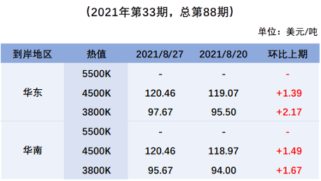 供给的另一方进口煤方面,价格也在上涨,成交清淡。据国家发改委价格监测中心发布的易煤网数据,8月最后一周(8月23日-8月27日),中国动力煤进口到岸价格指数(CICI)各指数继续上涨,4500K华东和华南到岸价均为120.46美元,较上期分别上涨1.39美元和1.49美元;3800K华东和华南到岸价分别为97.67美元和95.67美元,较上期分别上涨2.17美元和1.67美元。
