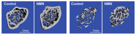 研究发现,在老年动物体内,干细胞因能量代谢失衡,成骨-成脂分化的平衡被打破,干细胞会更倾向于分化为脂肪细胞。补充NMN后,能够促进干细胞分化为成骨细胞,维持良好的平衡。因此NMN对于改善骨质疏松、肥胖有积极意义。