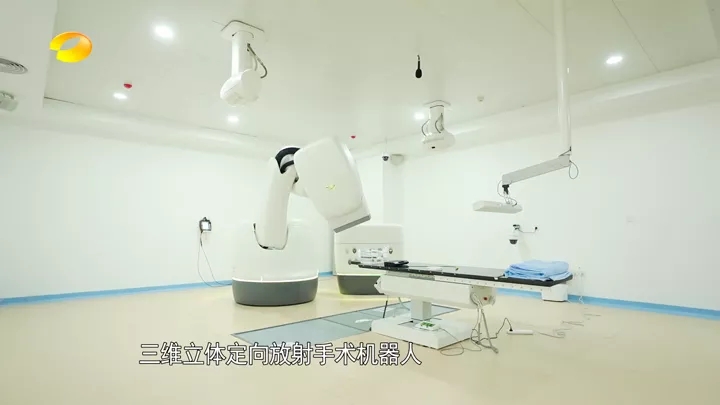 节目中介绍到的“三维立体定向放射手术机器人”,是广州中医药大学金沙洲医院国际肿瘤医疗中心引进的目前国内首台"全数字化安科锐M6立体定向放射外科机器人",它属于立体定向放射治疗(SBRT)的范畴,能够从三维立体的方向追踪病人体位、肿瘤位置和病人呼吸运动的反馈,并能在治疗过程中针对病人的肿瘤靶区(治疗的目标如肿瘤等)因呼吸运动而产生的微小移动的动态状态下通过医学影像的引导进行照射方向的实时修正。射波刀可治疗全身各部位的肿瘤,只需3~5次的照射,即可杀死肿瘤组织,是唯一综合“无伤口、无痛苦、无流血、无麻醉、恢复期短”五大优势于一身的智慧精准放疗利器,有着“卓越的肿瘤杀手”之称。