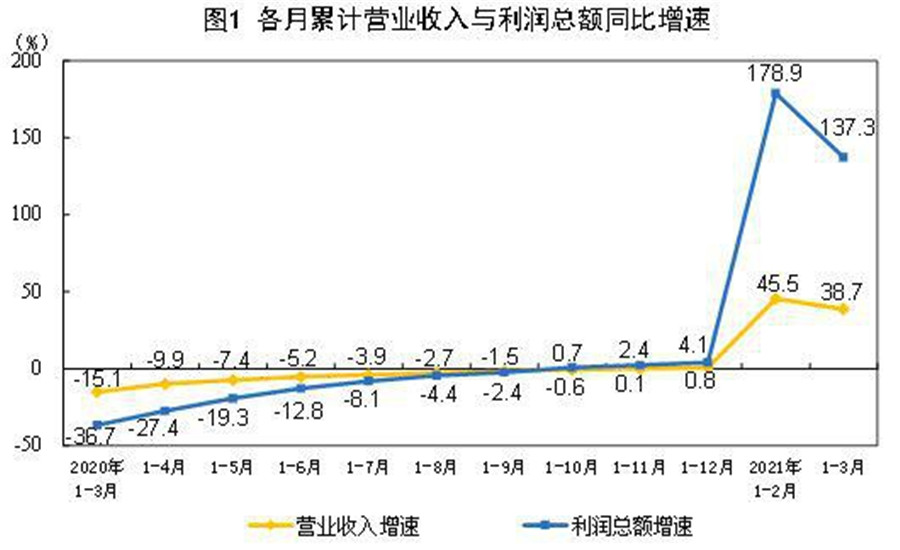 1—3月份,全国规模以上工业企业实现利润总额18253.8亿元,同比增长1.37倍(按可比口径计算,详见附注二),比2019年1—3月份增长50.2%,两年平均增长22.6%。