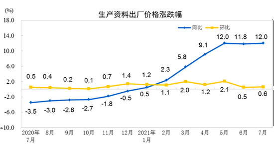 2021年7月份,全国工业生产者出厂价格同比上涨9.0%,环比上涨0.5%;工业生产者购进价格同比上涨13.1%,环比上涨0.9%。1—7月平均,工业生产者出厂价格比去年同期上涨5.7%,工业生产者购进价格上涨7.9%。
