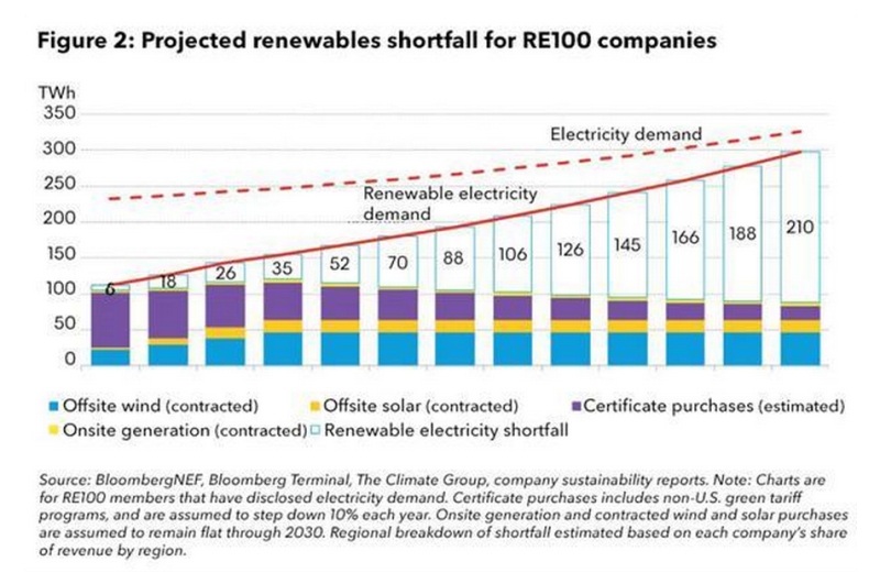 根据最新文件,RE100截至2019年共有221名成员,BNEF估计,到2030年,这221家RE100公司将需要额外购买210 TWh清洁电力,以实现其目标。如果通过异地PPA弥补这一短缺,则将在全球催化约105GW的新太阳能和风能建设。为这些新增加的项目提供资金预计将需要增加980亿美元的投资。