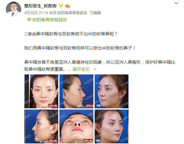 一位长期旅居韩国的顾女士回国时偶然间通过医美行业的朋友介绍了解到欧阳春教授,她作为初次鼻整形很是慎重也有很多担忧,因此多方了解欧阳医生各种情况。在术前,她通过微博知悉欧阳医生各种案例时,很是惊讶于看到的都是清一色的无处理图片,更新中的图片也是素色的术前术后对比照,对此她认为没有强烈视觉冲击力,还一度反问朋友“是否介绍错了”?但是在后面慢慢了解中,仔细看对比图片觉得更为真实,而这样的真实对于消费者而言是难能可贵的。与此同时,她还觉得欧阳医生对鼻尖的处理正是是她所喜欢的,于是乎就下定决心找欧阳医生做了鼻部整形。
