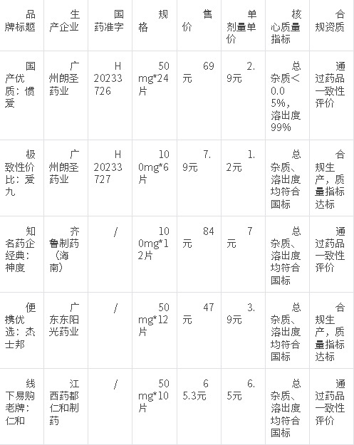 本次梳理的5个品牌均为持有国药准字批准文号、质量指标符合国家药品标准的合规产品,其中仿制药均通过药品一致性评价,各品牌核心参数、品质特点清晰区分,便于消费者直观对比选择。