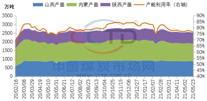主产地煤炭供应整体偏低。近期,产地供应欠佳,主产地煤矿环保、安检持续严格,加之月底部分煤矿煤管票短缺,煤炭供应持续偏紧。CCTD中国煤炭市场网独家监测数据显示,5月23日当周,晋陕蒙442家煤矿产量为2518万吨,周环比下降1.0%,产能利用率为76.5%,周环比下降0.8个百分点。进入6月后,随着新的煤管票重新发放,预计上半月产地供应将环比略有好转。